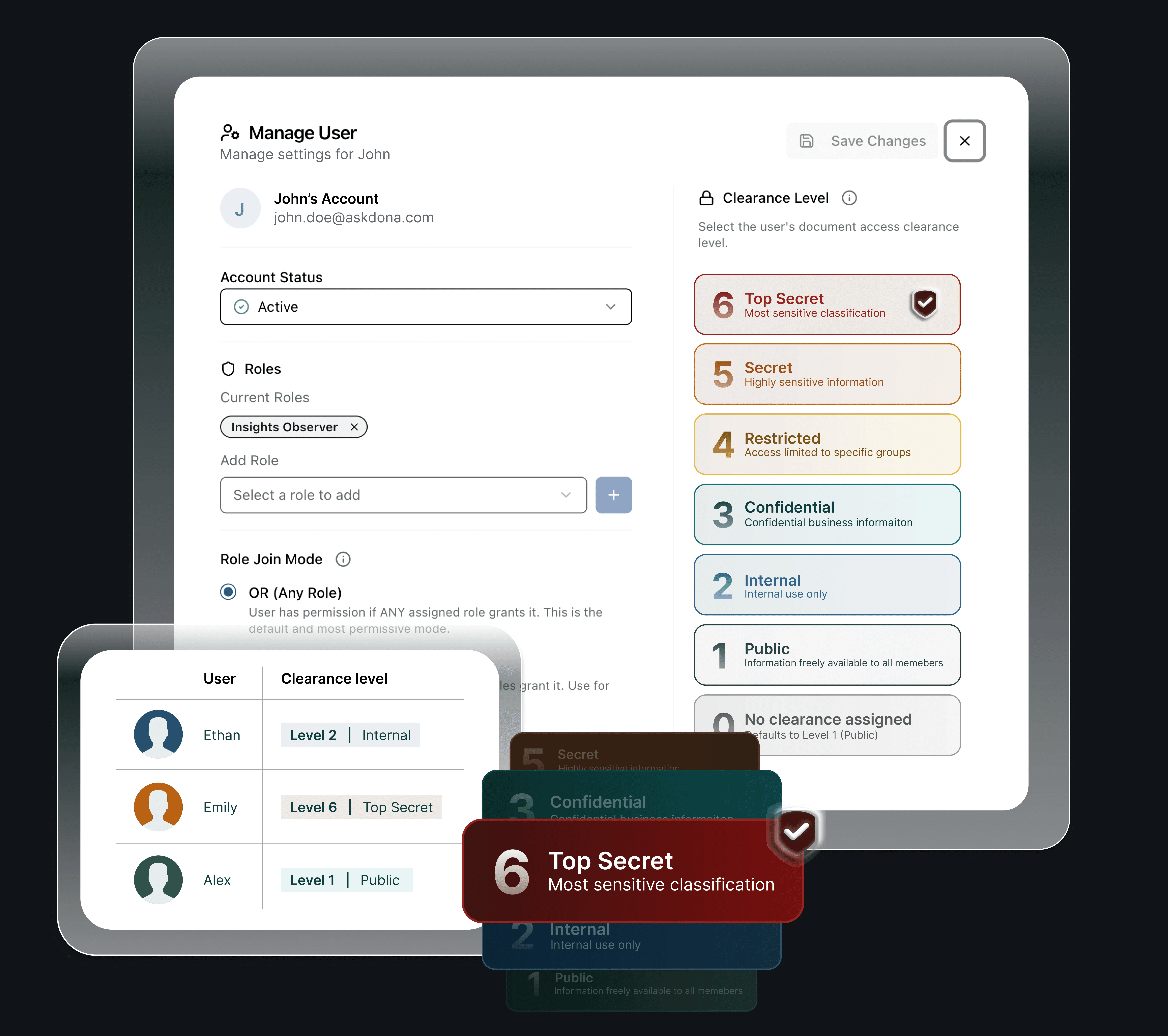 AskDonaでは、知識データベースにアップロードしたドキュメントに対して機密レベルを設定することが可能です。データの機密性について定義をすることでデータの取り扱いを組織内で制限できます。