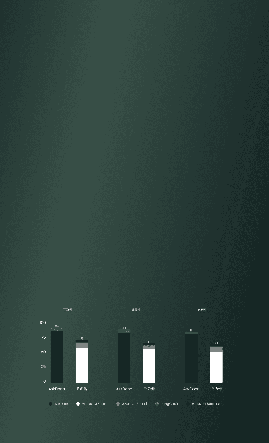 AskDonaの「dona-rag-2.0」は、チューニングやデータ加工の工数を要さず、初期段階から高精度な回答を実現します。スーパーコンピューター「富岳」を運用する理化学研究所R-CCSとの共同検証により、他社製品より20ポイント差以上、精度が高いことを実証済みです。